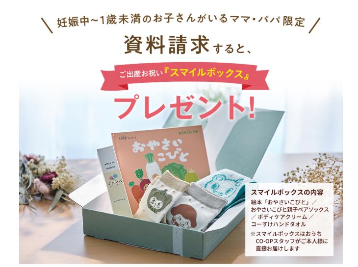 - 妊娠中~1歳未満のお子さんがいる家庭が対面で資料請求すると、スマイルボックスもプレゼント