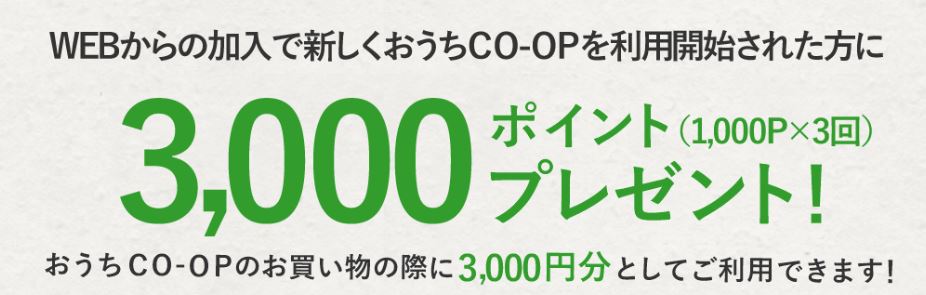 1000ポイントを3回分に振り分けプレゼントとなり、おうちコープ利用開始から4・5・6週目に付与となります。
