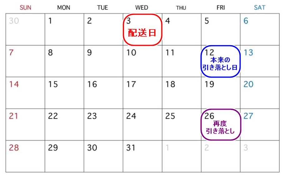 例えば、17日水曜日に商品が配送されたとしましょう。その場合、引き落とし日は翌週金曜日の26日です。