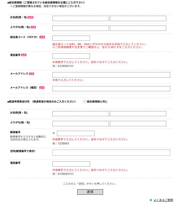 組合員コードも必要となりますので、用意しておきましょう。必要事項を入力後、送信を押してください。