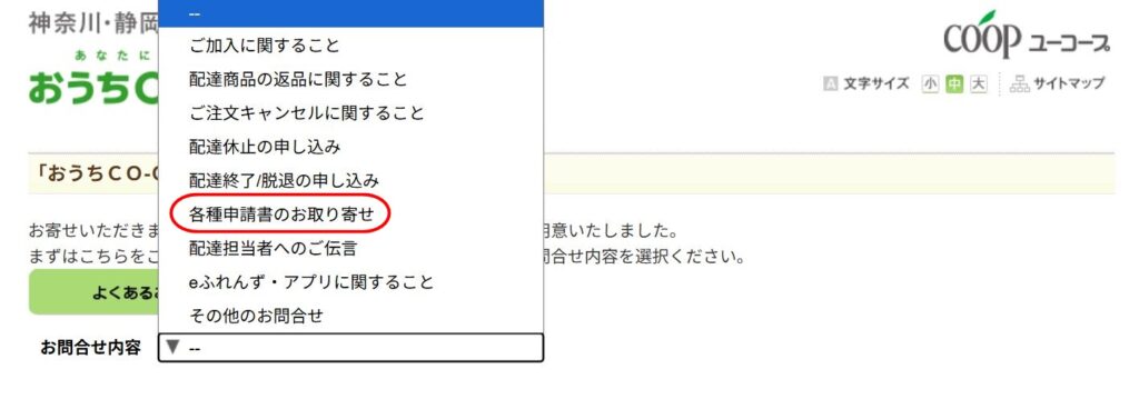 まずはおうちコープのお問い合わせにアクセスします。