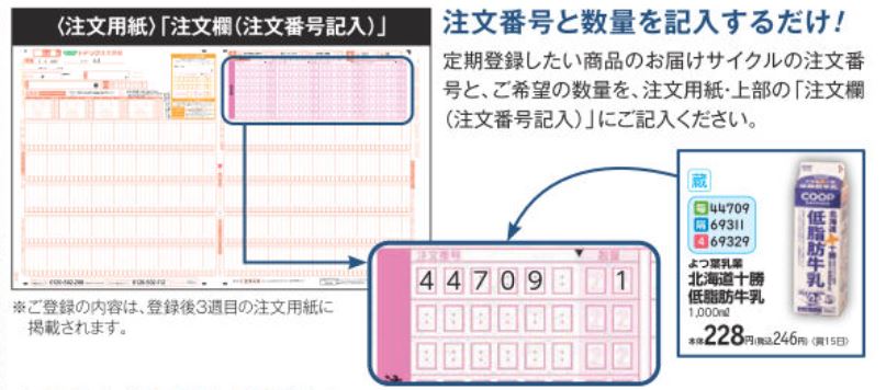 注文用紙で定期便登録する場合、カタログに掲載されている番号を記載しましょう。
