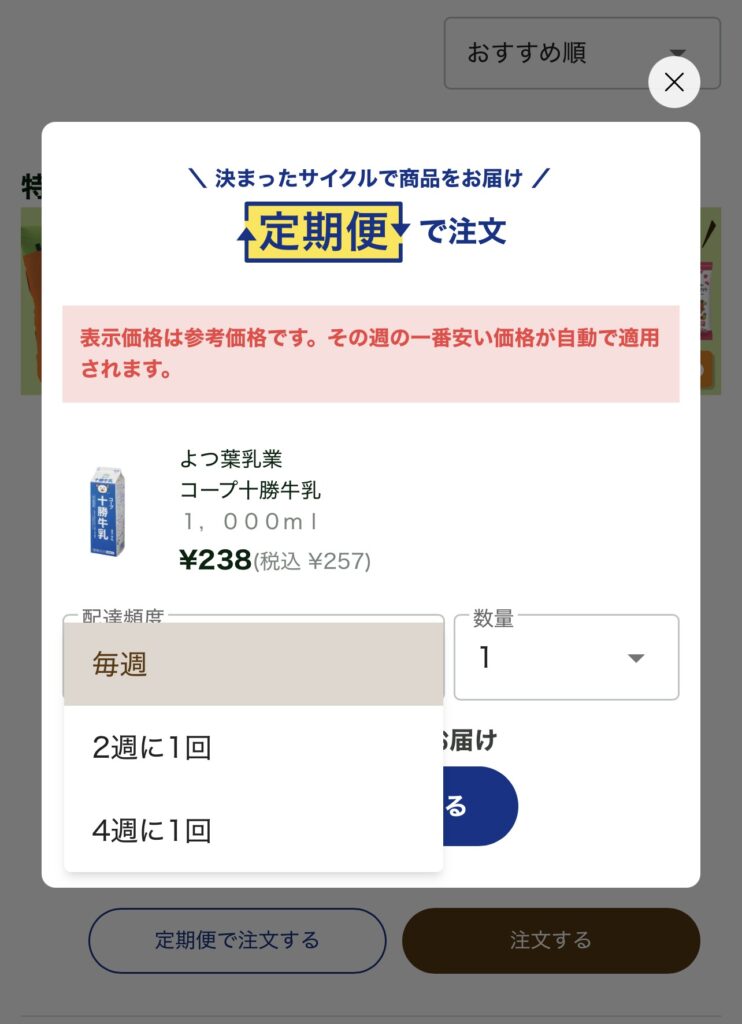 例えば、先ほど紹介した牛乳の場合、選べるサイクルは「毎週」「2週間に1回」「4週間に1回」の3パターン。