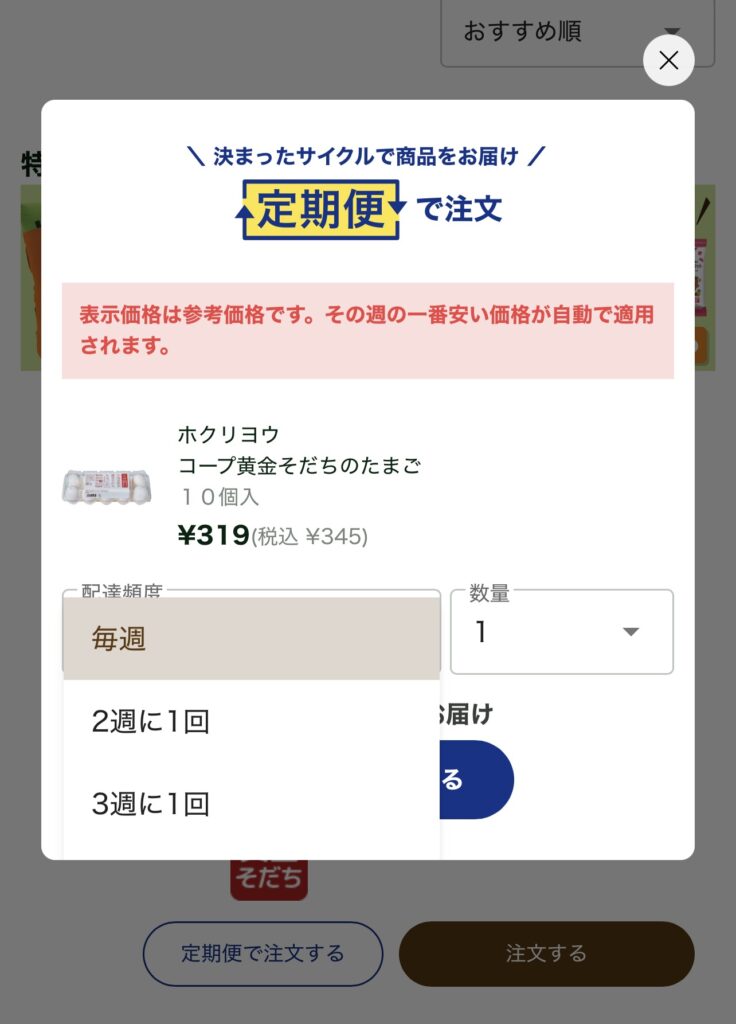 対して、卵の定期便注文を調べてみると、「毎週」「2週間に1回」「3週間に1回」からサイクルを選ぶ事が可能です。